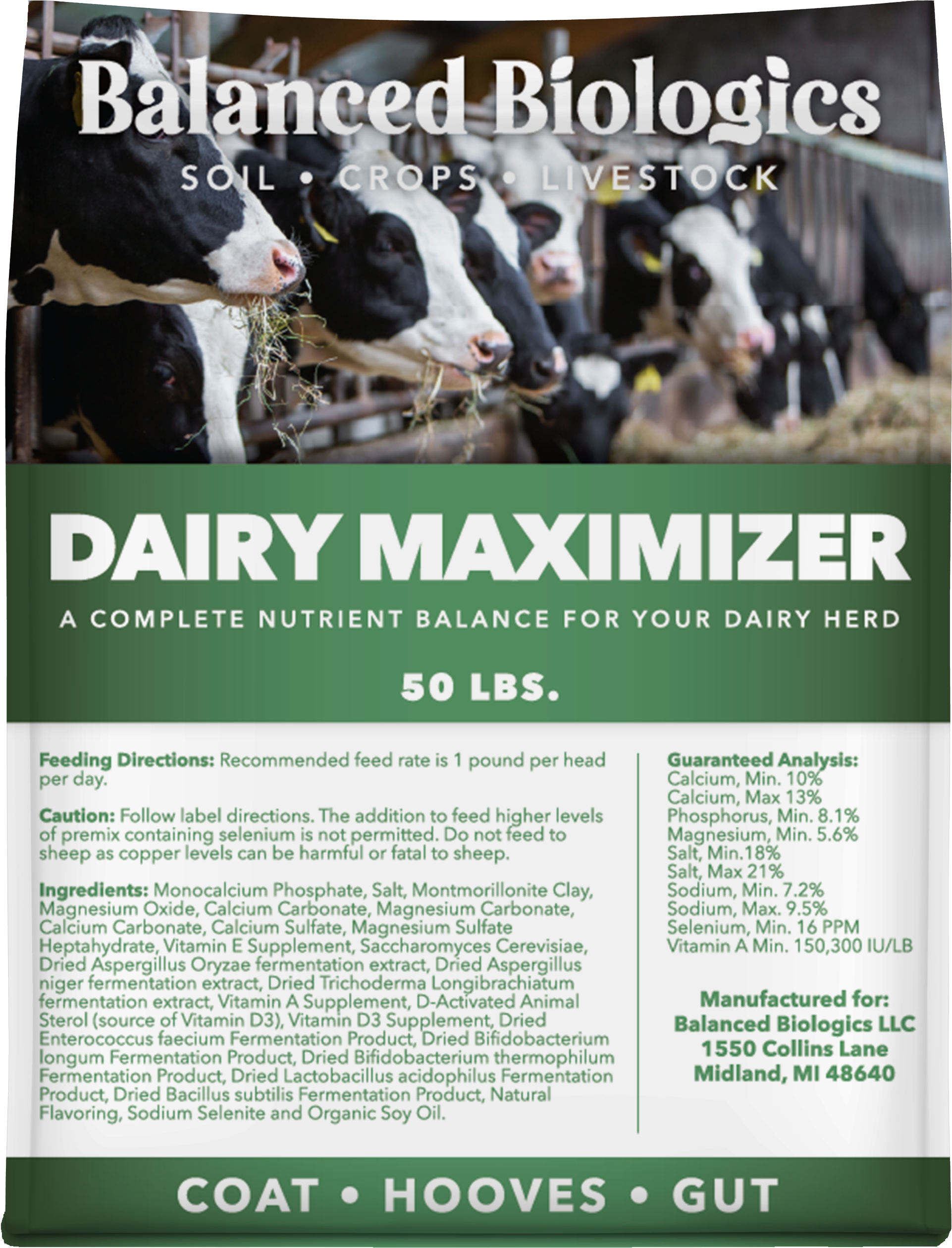 Dairy maximizer is a unique blend of minerals rare earths and secondary metabolites blended with vitamins. This product is designed for dairy cattle of all types and sizes. Works for dry cows and heifers too.